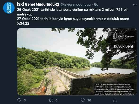 27 Ocak 2021 tarihi itibariyle içme suyu kaynaklarımızın doluluk oranı: %34,22