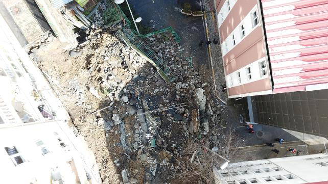 Hastanesinin arka bahçesindeki istinat duvarı, öğle saatlerinde henüz belirlenemeyen nedenle yıkıldı.