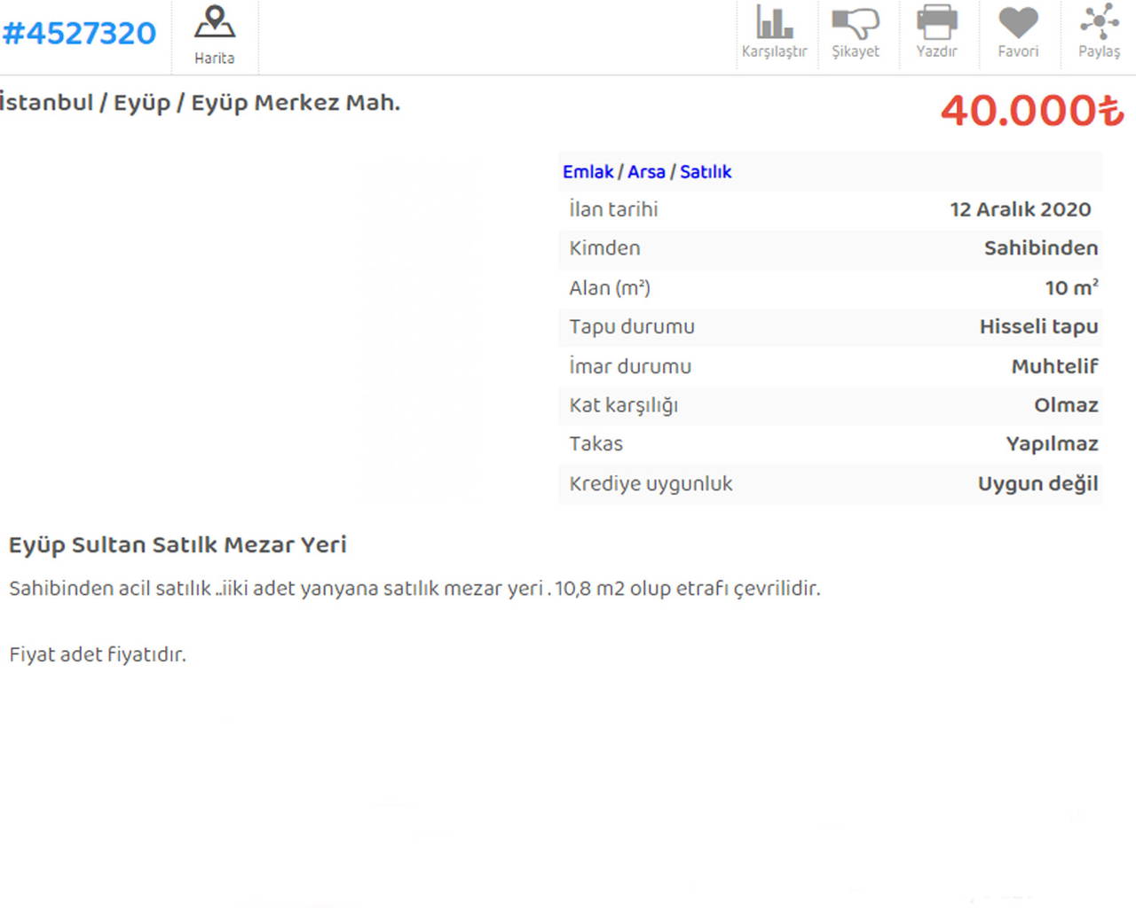 DHA muhabirinin telefonla ulaştığı internet üzerinden mezar yeri satan biri “Yerimiz Karacaahmet Mezarlığı'nda hem cadde kapısına hem mezarlığın içindeki ana yola yakın" diyerek şu bilgileri verdi: