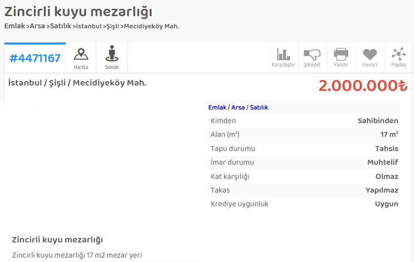 İstanbul'da mezar yeri ücretlerine geçtiğimiz hafta zam geldiği açıklanmıştı. 1 Nisan 2021'den itibaren yürürlüğe girecek yeni fiyatlara göre İstanbul'da mezarlık yer bedelleri 100 lira ile 37 bin 400 liraya arasında değişiyor. Her yıl ortalama 70 bin kişinin hayatını kaybettiği şehirde, özellikle Karacaahmet, Zincirlikuyu, Aşiyan, Edirnekapı gibi mezarlıklarda yer bulunmamasını fırsat bilen kişiler, internet üzerinde yeni bir pazar oluşturdu. Yıllar önce satın aldıkları ya da akrabalarından miras kalan alanları satışa çıkaran kişiler, bu ilanlarda 'Sabancı Mezarlığı'na çok yakın, 'yeşillikler içinde' gibi ibarelere de yer verdi. İlanlarda 2 milyon liraya mezar yeri satan bile var. Zincirlikuyu Mezarlığı'nda 17 metrekarelik alanının bulunduğunu belirten bir kişi, burayı 2 milyon liraya satışa çıkarmış durumda. Bir başka kişi ise 150 bin liraya satışa sunduğu mezar yerinin "Süleyman Hilmi Tunahan Hazretlerine komşu" olduğunu belirtmiş. Benzer şekilde bir çok ilan bulmak mümkün.