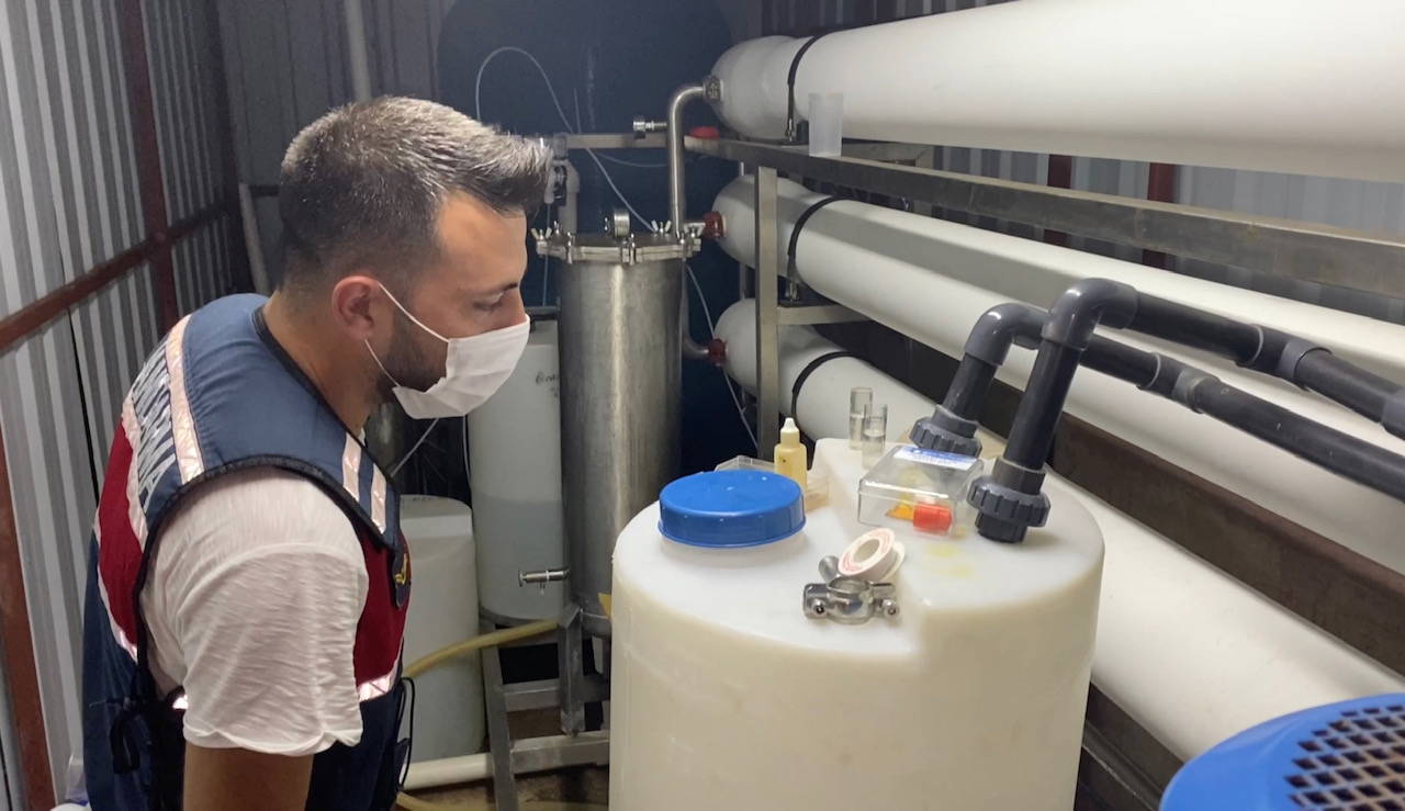 Ağaçların arasında kamufle edilmiş su arıtma makinesine giden kaçak bir kapı olduğu görüldü. Tesis yöneticileri ile görüşen jandarma ekipleri, işletmenin gerekli ruhsat ve çalışma belgelerini istedi.