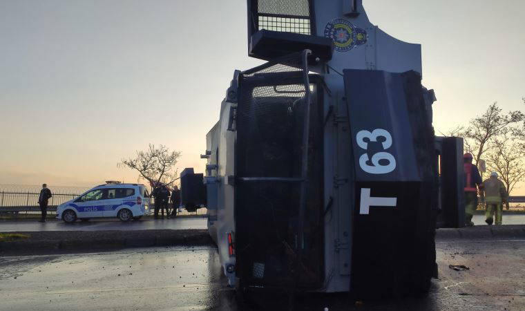 Küçükçekmece D-100 Karayolu yanyolda ilerlerken lastiği patladığı iddia edilen ve refüje çarpan toplumsal olaylara müdahale aracı (TOMA) devrildi.