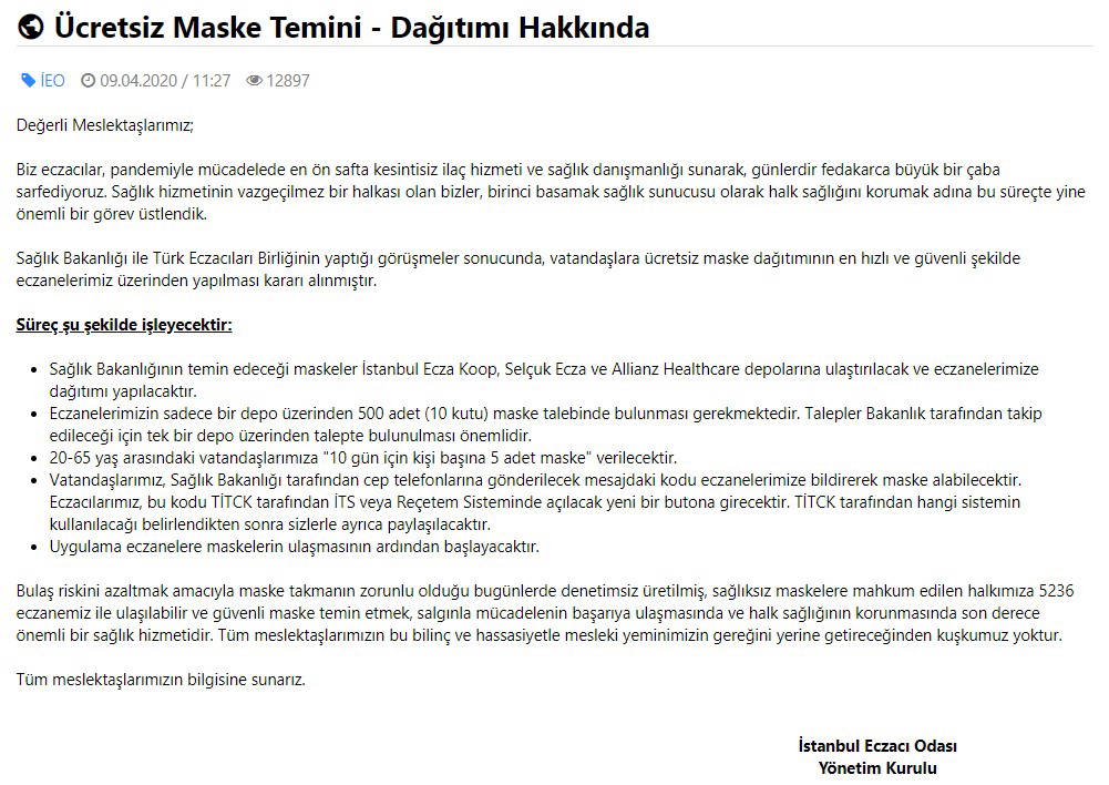İstanbul Eczacı Odası tarafından yapılan açıklamada "Sağlık Bakanlığı ile Türk Eczacıları Birliğinin yaptığı görüşmeler sonucunda, vatandaşlara ücretsiz maske dağıtımının en hızlı ve güvenli şekilde eczanelerimiz üzerinden yapılması kararı alınmıştır" ifadeleri kullanıldı.