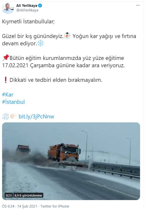 ''Kıymetli İstanbullular; Güzel bir kış günündeyiz. Yoğun kar yağışı ve fırtına devam ediyor. Bütün eğitim kurumlarımızda yüz yüze eğitime 17.02.2021 Çarşamba gününe kadar ara veriyoruz. Dikkati ve tedbiri elden bırakmayalım.''