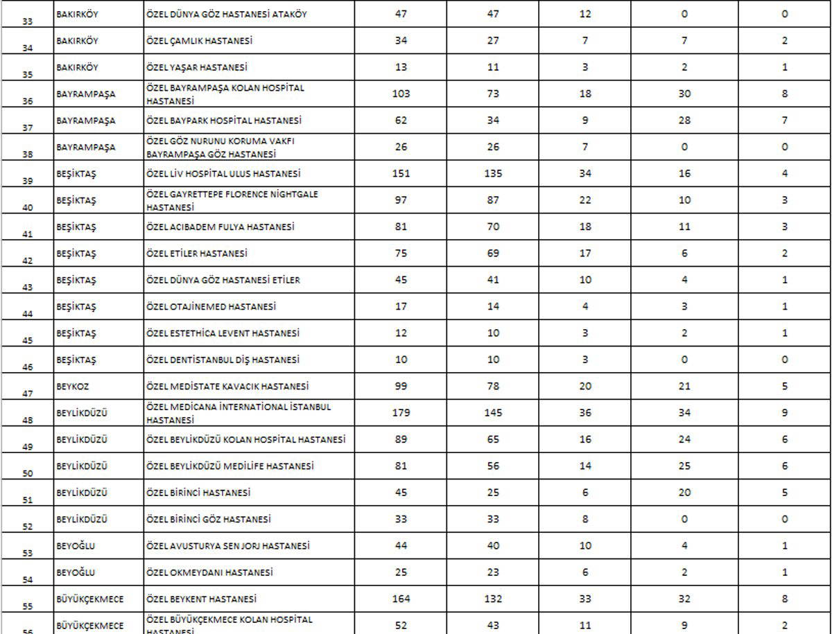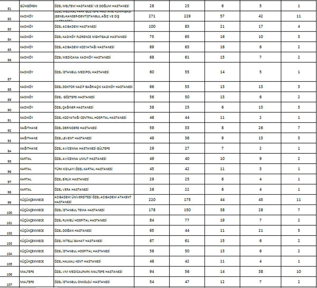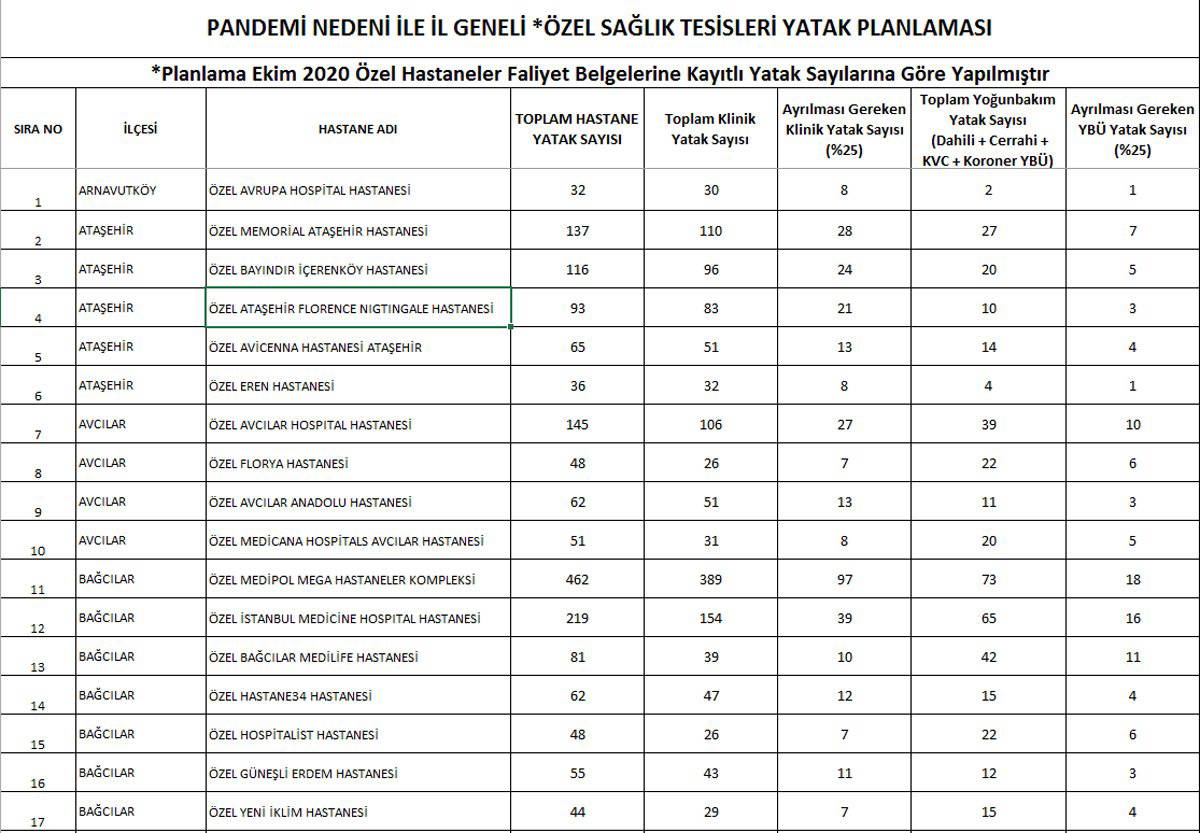 İstanbul’da sağlık müdürlüğünün yaptığı planlamaya göre hastanelerde corona hastaları için ayrılacak yatak sayılarını ise Sağlık Bakanlığı şöyle belirledi: