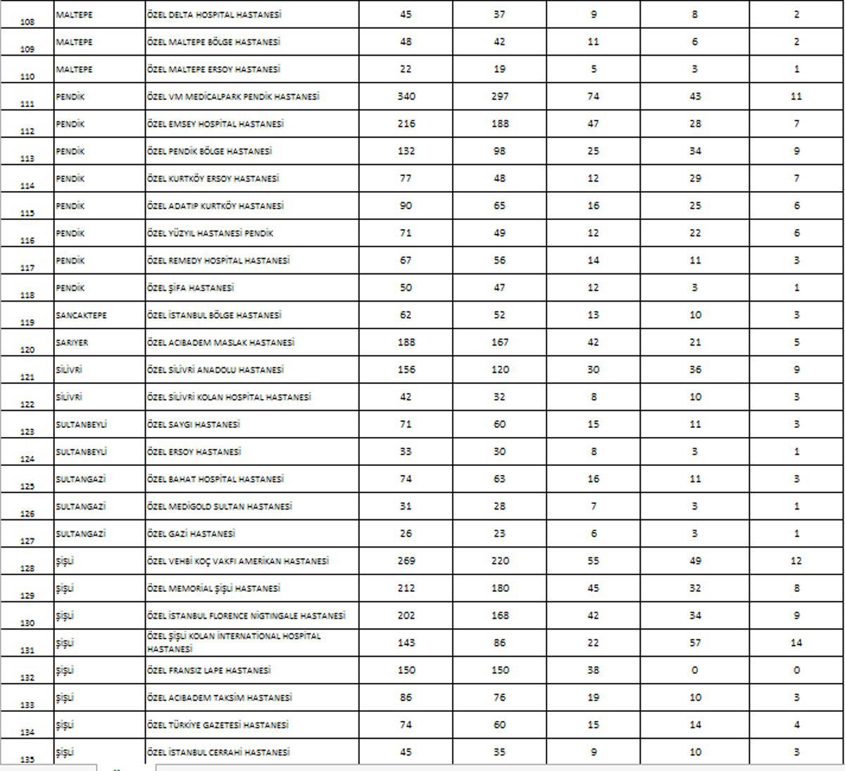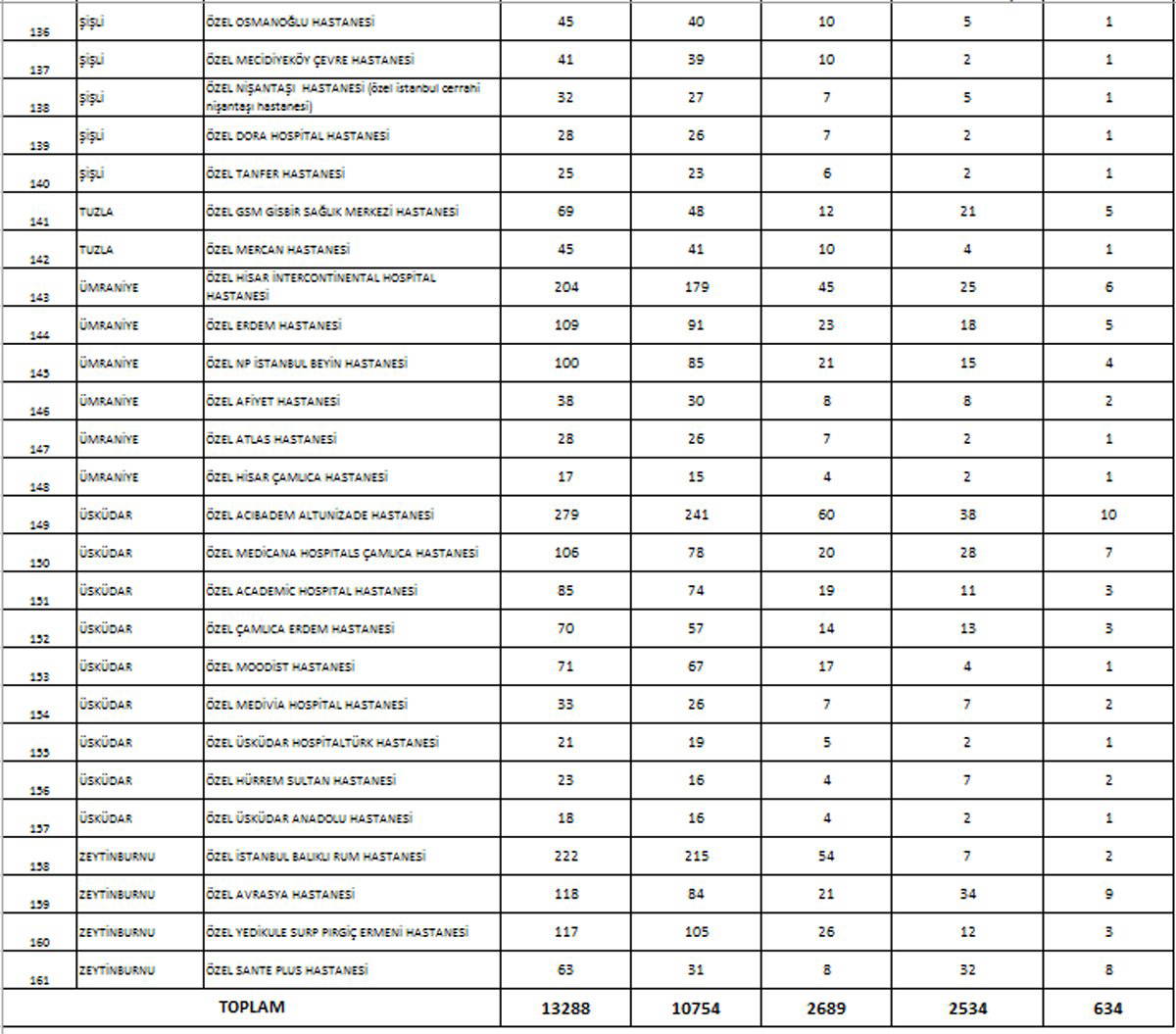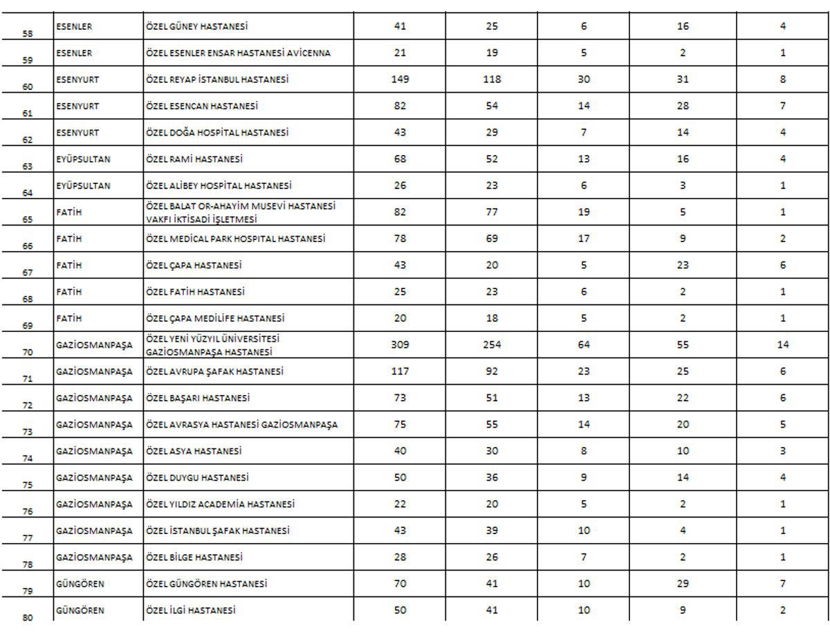 İstanbul’da sağlık müdürlüğünün yaptığı planlamaya göre hastanelerde corona hastaları için ayrılacak yatak sayılarını ise Sağlık Bakanlığı şöyle belirledi: