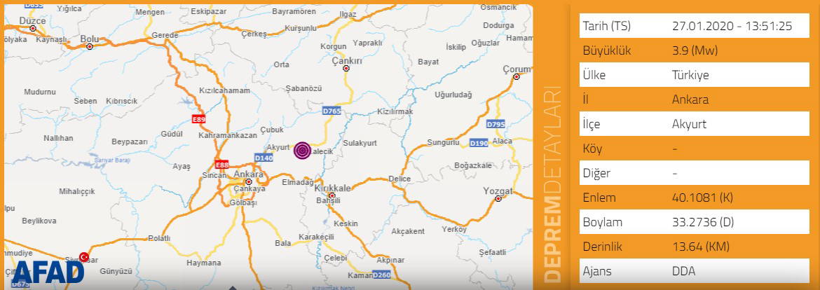 AFAD'dan alınan bilgiye göre Ankara'nın Akyurt ilçesinde saat 13.51'de 3.9 büyüklüğünde deprem meydana geldi. Depremin derinliği 5 kilometre olarak açıklandı.
