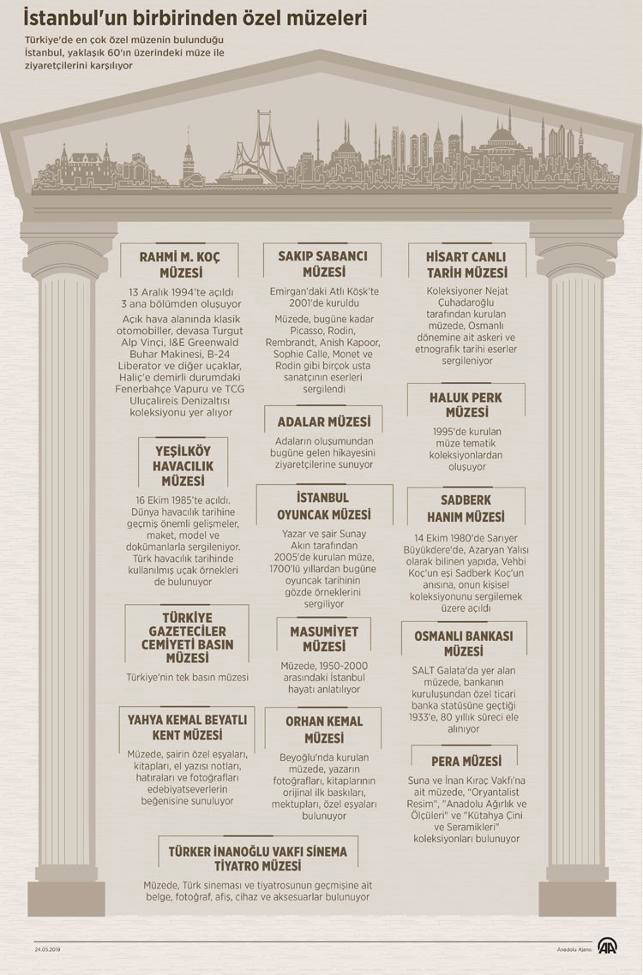 Türkiye'de en çok özel müzenin bulunduğu İstanbul, Kültür ve Turizm Bakanlığı, TBMM Milli Saraylar, TSK, Vakıflar Genel Müdürlüğü, İstanbul Büyükşehir Belediyesi, üniversite ve özel müzeler olmak üzere 90'nın üzerinde mekanıyla ziyaretçilerini ağırlıyor.