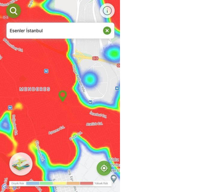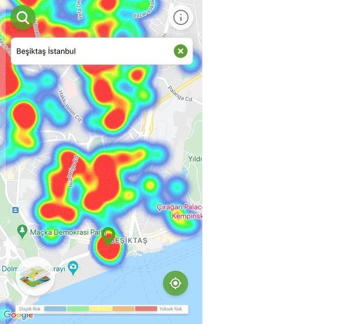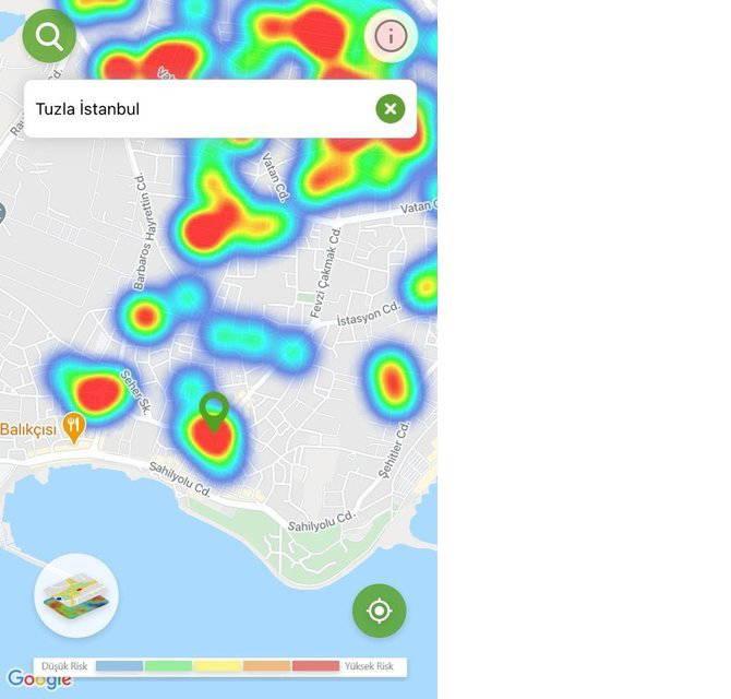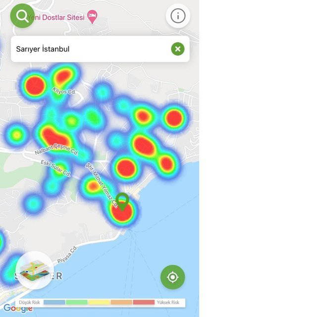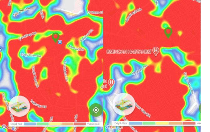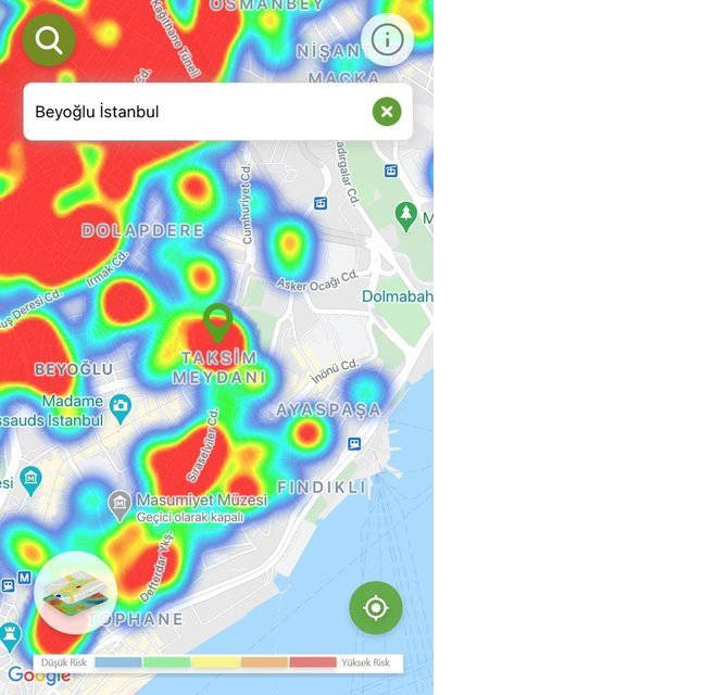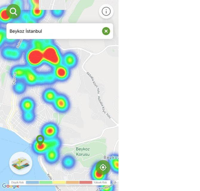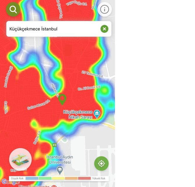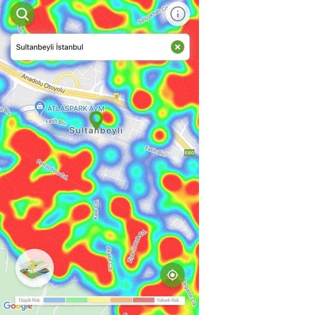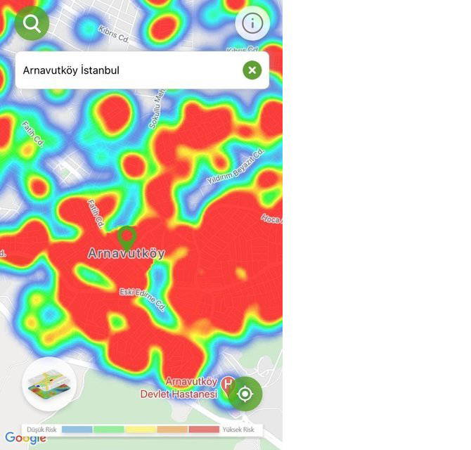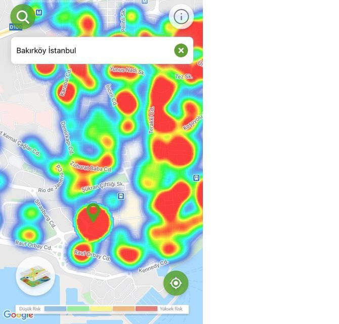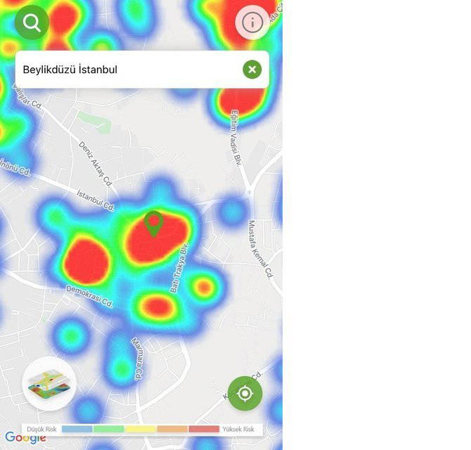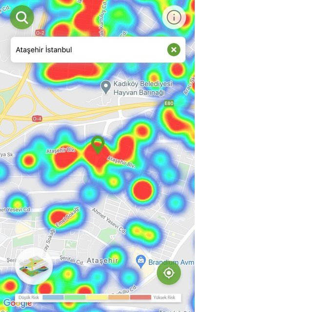 Hayat Eve Sığar uygulamasında İstanbul’un koronavirüs yoğunluk haritası güncellendi. Uygulamaya göre kırmızı alanlar yüksek riskli alanlar gösterilirken; mavi alanlar düşük riskli bölgeleri temsil ediyor.