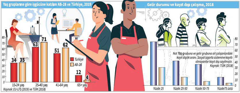 Öte yandan bu yaş grubundaki sigortasız çalışma oranının diğer yaş gruplarına nazaran çok daha fazla oluşu bu gruptaki bazı kişilerin halihazırda sosyal sigorta sistemlerinden emekli oldukları ancak yine de ek bir gelir için çalıştıkları ihtimalini akla getiriyor.