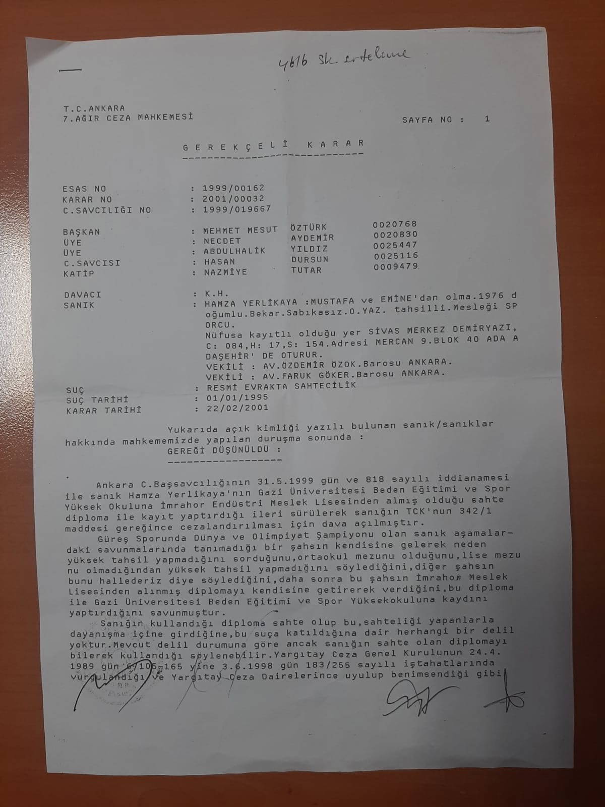 “Güreş sporunda dünya ve olimpiyat şampiyonu olan sanık aşamalardaki savunmalarında tanımadığı bir şahsın kendisine gelerek neden yüksek tahsil yapmadığını sorduğunu, ortaokul mezunu olduğunu, lise mezunu olmadığından yüksek tahsil yapmadığını söylediğini, diğer şahsın bunu hallederiz diye söylediğini daha sonra bu şahsın İmrahor Meslek Lisesi’nden alınmış diplomayı kendisine getirerek verdiğini, bu diploma ile Gazi Üniversitesi Beden Eğitimi ve Spor Yüksekokulu’na kaydını yaptırdığını savunmuştur. Sanığın kullandığı diplomanın sahte olup bu, sahteliği yapanlarla dayanışma içine girdiğine, bu suça katıldığına dair herhangi bir delil yoktur. Mevcut delil durumuna göre ancak sanığın sahte olan diplomayı bilerek kullandığı söylenebilir.”