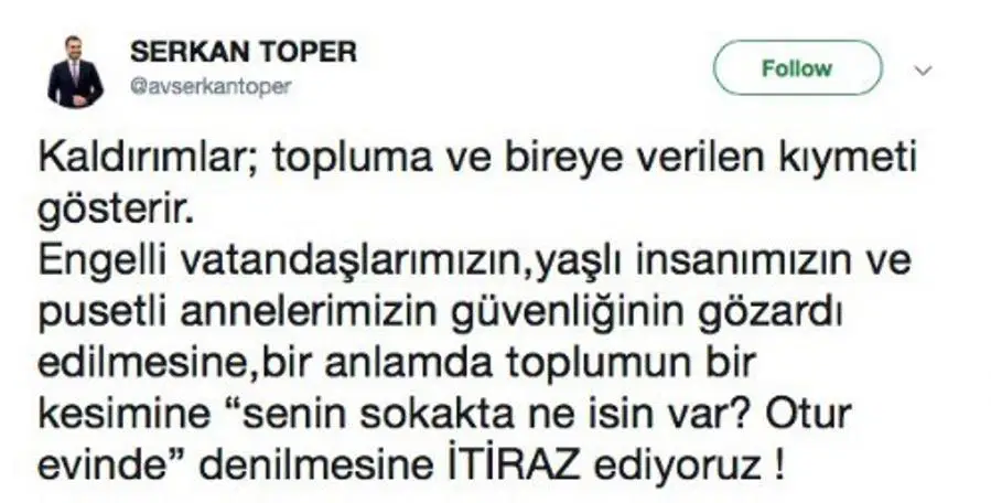 Odatv'nin haberine göre, Toper seçim vaatlerini açıklarken sosyal medya hesabından "Kaldırımlar; topluma ve bireye verilen kıymeti gösterir. Engelli vatandaşlarımızın, yaşlı ve pusetli annelerimizin güvenliğinin gözardı edilmesine, bir anlamda toplumun bir kesimine 'senin sokakta ne işin var? Otur evinde' denilmesine İTİRAZ ediyoruz!" paylaşımını yaptı.