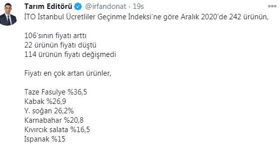 Verilere göre; 106 ürünün fiyatı arttı, 22 ürünün fiyatı düştü, 114 ürünün fiyatı ise değişmedi. Donat açıklamasında: 'Fiyatı en çok artan ürünler, Taze Fasulye %36,5 Kabak %26,9 Y. soğan 26,2% Karnabahar %20,8 Kıvırcık salata %16,5 Ispanak %15' ifadelerini kullandı.