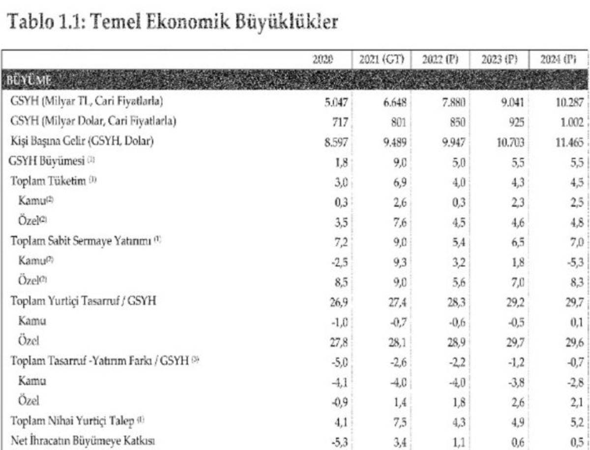 OVP'ye göre GSYH bu yıl 6 trilyon 648 milyar lira olacak. 2022 yılında ise 7 trilyon 880 milyar lira olarak programlandı. 2023'te 9 trilyon 41 milyar lira, 2024'te 10 trilyon 287 milyar lira öngörüldü. Dolar bazında ise GSYH bu yıl 801 milyar dolar, 2022'de 850 milyar dolar, 2023'te 925 milyar dolar 2024'te ise 1 trilyon dolar bekleniyor.
