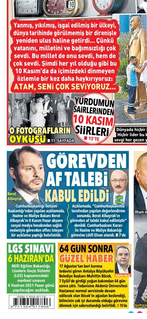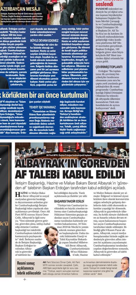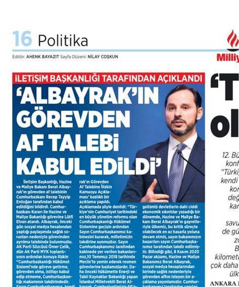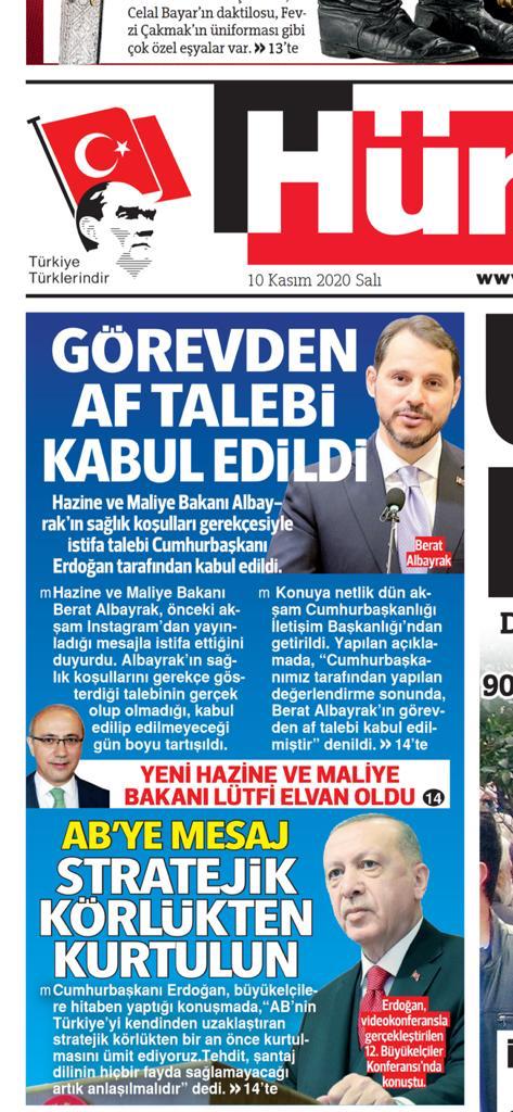 Albayrak'ın istifa duyurusu, Cumhurbaşkanlığı İletişim Başkanlığı tarafından yapılan yazılı açıklamaya istinaden sözkonusu gazetelerin sayfalarına taşındı.