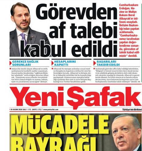 Cumhurbaşkanı Tayyip Erdoğan’ın damadı Berat Albayrak’ın Hazine ve Maliye Bakanlığından istifa ettiğini duyurduğu açıklaması sonrası sessizliğe bürünen Hükümet'e yakın gazeteler, Cumhurbaşkanlığından yapılan açıklama sonrası haberi baş sayfalarında "gördü".