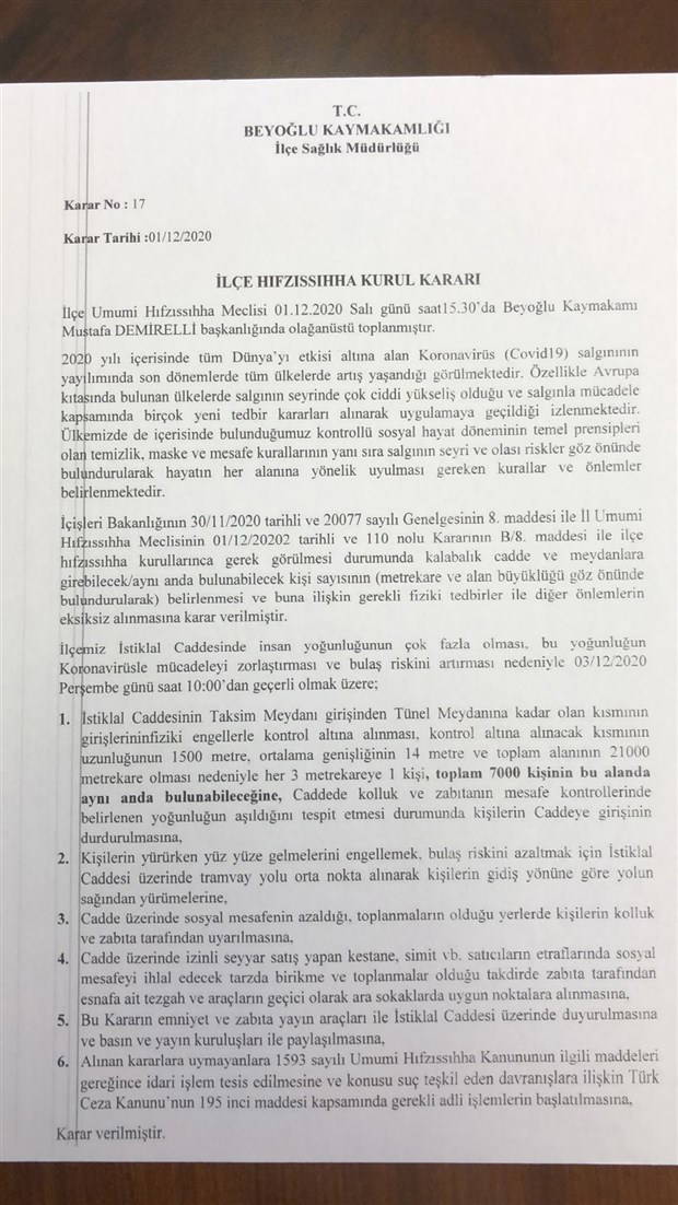 Beyoğlu İlçe Hıfzıssıhha Kurulu’nun aldığı karar şöyle: