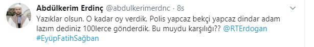 Erdinç diğer bir paylaşımında "Polis, bekçi, memur yapmak için dindar adam lazım dediniz. Yüzlerce yolladık. FETÖ'ye karşı yanınızdaydık, karşılığı bu muydu?" yorumunda bulundu.