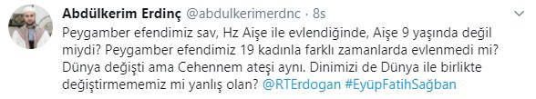 "Peygamber efendimiz sav, Hz Aişe ile evlendiğinde, Aişe 9 yaşında değil miydi? Peygamber efendimiz 19 kadınla farklı zamanlarda evlenmedi mi? Dünya değişti ama Cehennem ateşi aynı. Dinimizi de Dünya ile birlikte değiştirmememiz mi yanlış olan?"