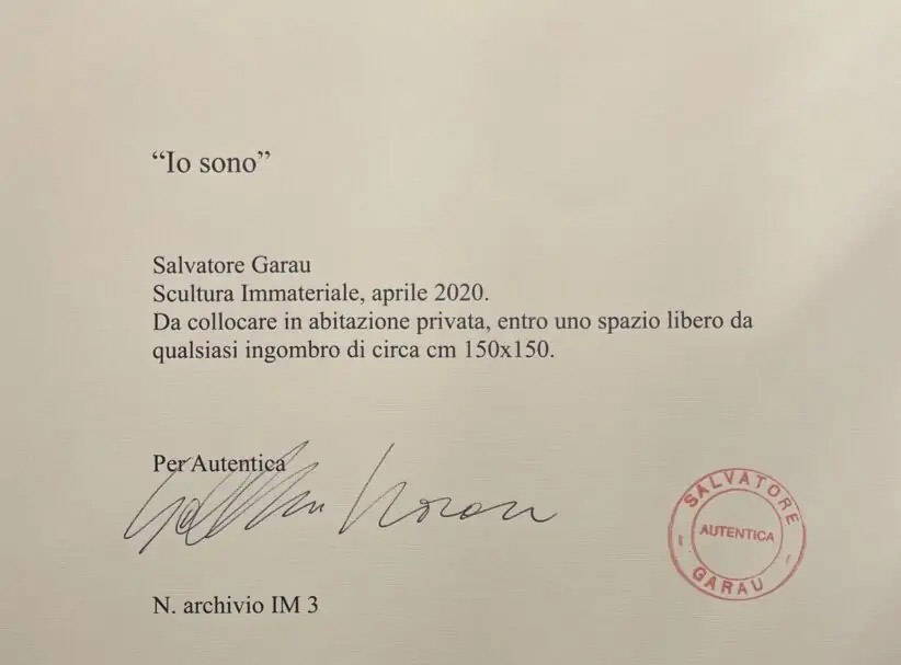 İtalya’da görünmeyen heykel binlerce Avro’ya alıcı buldu. İtalyan heykeltraş Salvatore Garau’nun “Io sono” (Benim) adlı görünmeyen eseri Milano’da bulunan Art-Rite müzayede evinde 6 bin Avro fiyatla 18 Mayıs’ta açık arttırmaya çıkarılmıştı.