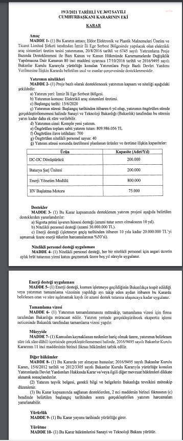 Dünyadaki otomotiv devlerinin en büyük tedarikçisi olan, 1998 yılından bu yana da ESBAŞ'ta otomobiller için ateşleme bobini üreten İtalyan elektronik devi Eldor, Cumhurbaşkanı kararıyla, büyük ölçekli bir yatırım desteğine hak kazandı. Eldor'un İzmir'de yapılacak elektrikli araç sistemleri üretim tesisi yatırımına proje bazlı devlet yardımı verilecek. Buna ilişkin Cumhurbaşkanı kararı, Resmi Gazete'de yayımlanarak yürürlüğe girdi.