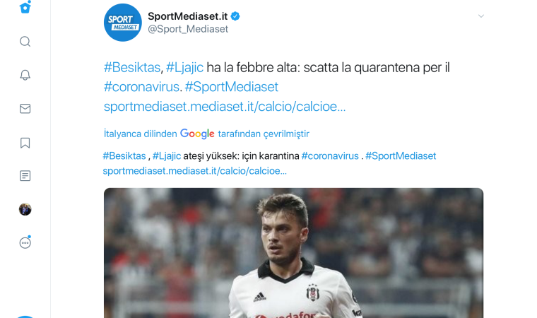 İtalyan basını Beşiktaşlı Ljajic için şok bir iddia ortaya attı. Ünlü İtalyan yayın organı SportsMediaset, Beşiktaşlı oyuncu Adem Ljajic’in grip ve yüksek ateş nedeniyle karantinaya alındığını iddia etti. Haberde Türkiye’de Coronavirus korkusu olduğu vurgusu da yapan Mediaset, Ljajic’in Trabzonspor maçında oynatılmayacağını belirtti. Ancak haberde Ljajic için coronavirus endişesi ifadesi yer almıyor.
