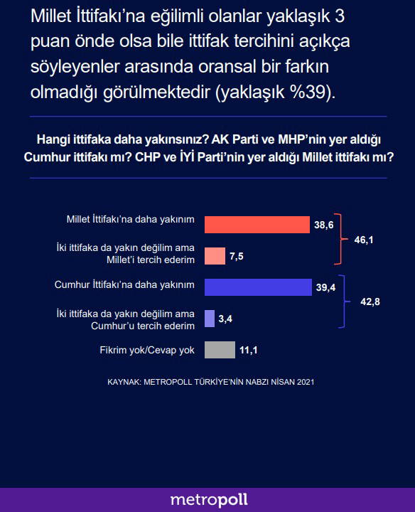 Araştırmada Türkiye'nin gündeminde yer alan konular yurttaşlara soruldu. Bunlardan biri de "Hangi ittifaka daha yakınsınız? AK Parti ve MHP'nin yer aldığı Cumhur ittifakı mı? CHP ve İYİ Parti'nin yer aldığı Millet ittifakı mı?" sorusu oldu. Bu soruya yanıt yüzde 38.6'lık kesim "Millet İttifakı'na yakınım" yanıtını verdi. "Cumhur İttifakına yakınım" diyenlerin oranı ise yüzde 42.8 olarak belirlendi.
