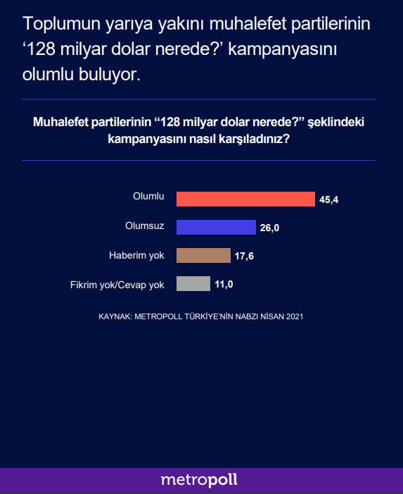 Ankette yurttaşlara "Muhalefet partilerinin '128 milyar dolar nerede?' şeklindeki kampanyasını nasıl karşıladınız?" sorusu da yöneltildi. Soruya yanıt verenlerin yüzde 45.4'ü bu sorunun yöneltilmesini olumlu bulduğunu ifade etti. "Olumsuz" yanıtını verenlerin oranı ise yüzde 26'da kaldı.