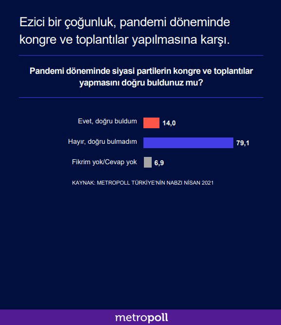 Ankette, "Pandemi döneminde siyasi partilerin kongre ve toplantılar yapmasını doğru buldunuz mu? sorusuna ise yüzde 79,1'le ezici bir çoğunluk "Hayır, doğru bulmadım" yanıtını verdi.