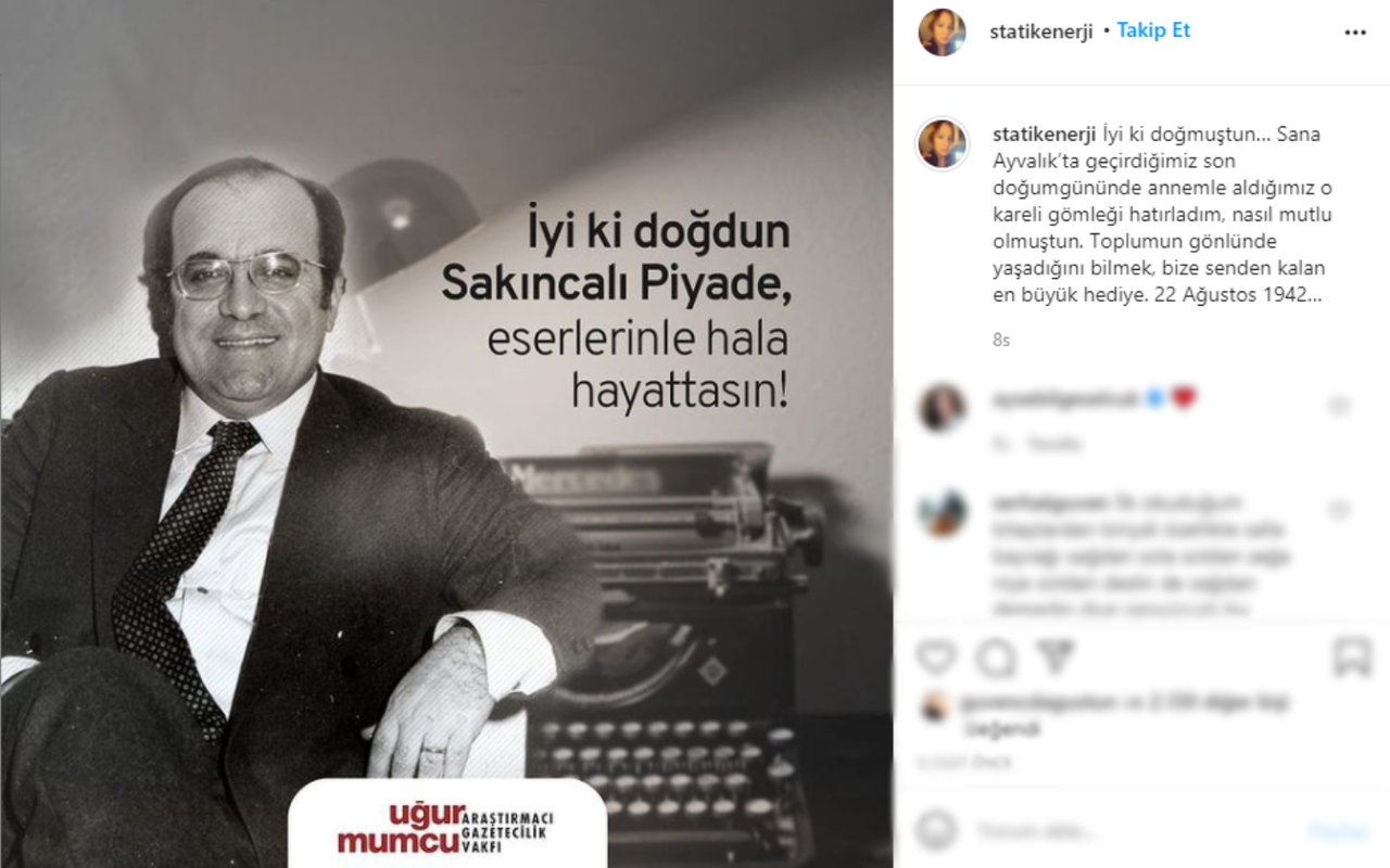 Özge Mumcu Aybars paylaştığı yazıda şu ifadelere yer verdi: "İyi ki doğmuştun... Sana Ayvalık'ta geçirdiğimiz son doğum gününde annemle aldığımız o kareli gömleği hatırladım, nasıl mutlu olmuştun. Toplumun gönlünde yaşadığını bilmek, bize senden kalan en büyük hediye. 22 Ağustos 1942..."