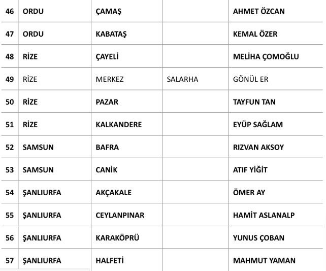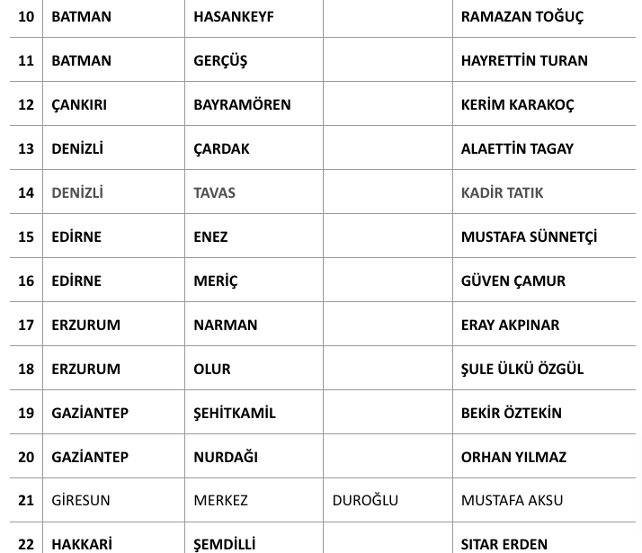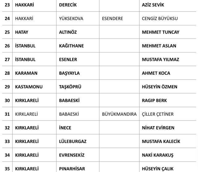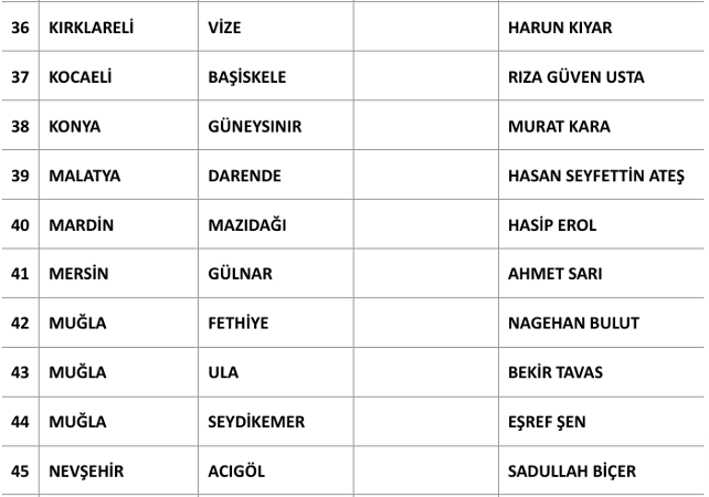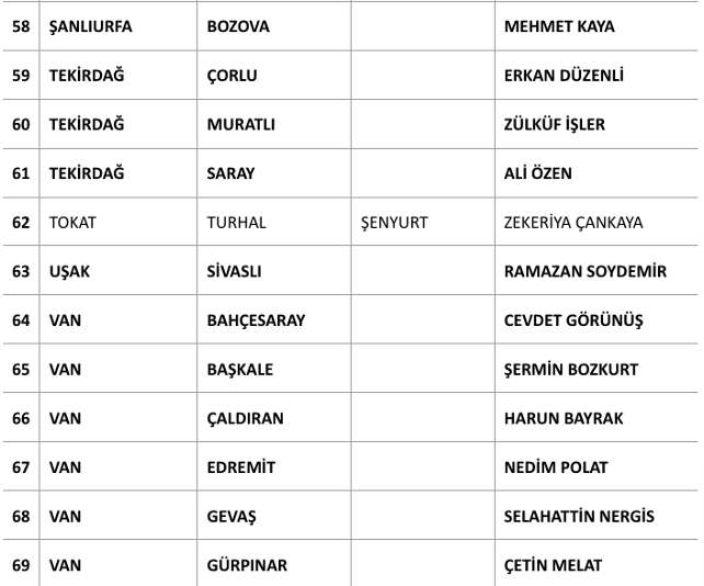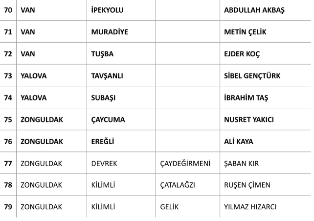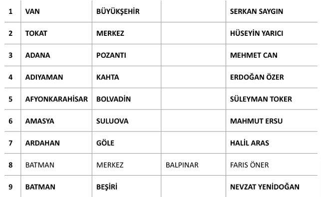 Açıklanan adayların listesi şu şekilde: