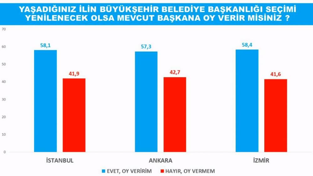 Araştırmaya katılan vatandaşlara "Yaşadığınız ilin Büyükşehir Belediyes Başkanlığı seçimi yenilenecek olsa mevcut başkana oy verir misiniz" sorusu yöneltildi.İstanbul'da vatandaşların yüzde 58.1'i Ekrem İmamoğlu'na, Ankara'da yüzde 57.3'ü Mansur Yavaş'a, İzmir'de yüzde 58.4'ü Tunç Soyer'e "Evet, oy veririm" dedi.