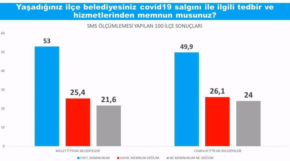 Araştırmaya katılanlara sorulan "Yaşadığınız ilçe belediyesinin Covid-19 salgını ile ilgili tedbir ve hizmetlerinden memnun musunuz" sorusuna Millet İttifakı yönettiği ilçelerde yaşayan vatandaşların yüzde 53'ü "Evet, memnunum" yanıtını verdi. Cumhur İttifakı'nın yönettiği ilçelerde yaşayan vatandaşların ise yüzde 49.9'u "Evet, memnunum" yanıtını verdi.