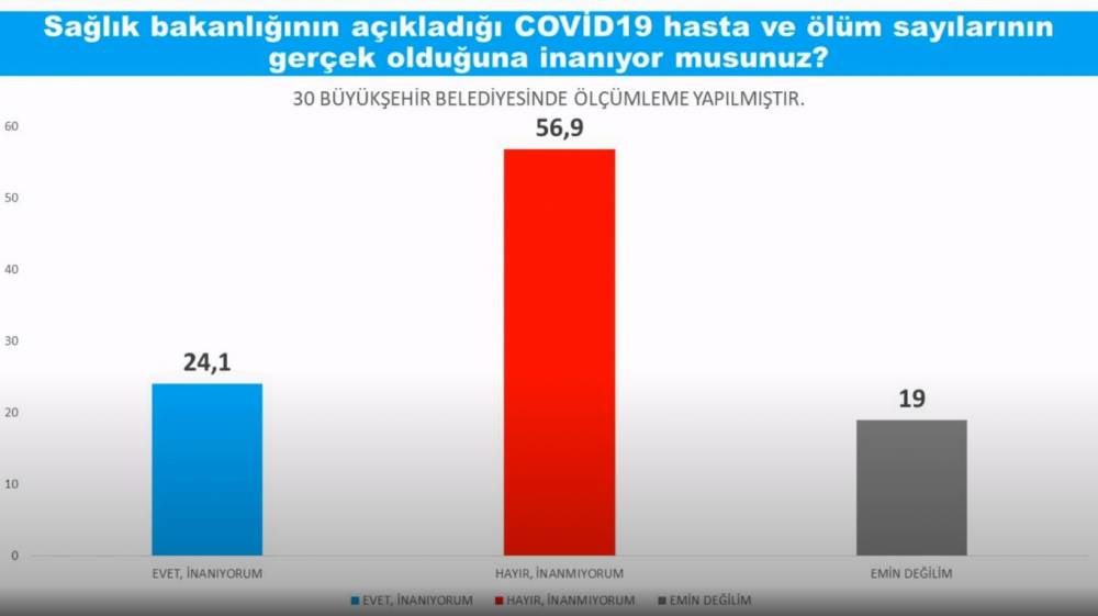 Araştırmada 30 Büyükşehir'de yaşayan vatandaşlara "Sağlık Bakanlığı'nın açıkladığı Covid-19 hasta ve ölüm sayılarının gerçek olduğuna inanıyor musunuz" sorusu da yöneltildi. Vatandaşların yüzde 56.9'u "Hayır, inanmıyorum" yanıtını verirken, "Evet, inanıyorum" yanıtını verenlerin oranı ise yüzde 24.1 oldu.