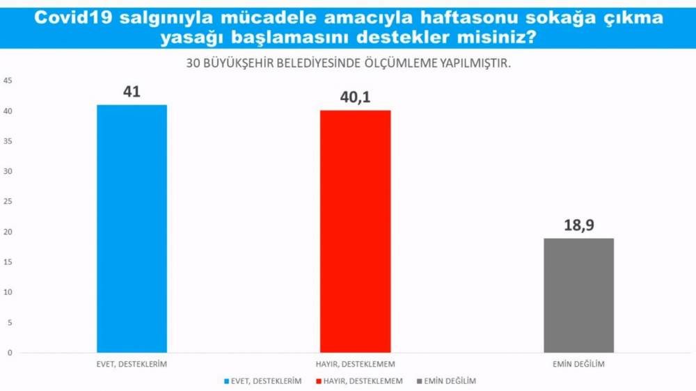 Koronavirüs salgını nedeniyle haftasonu yasaklarını destekleyenler çoğunlukta çıktı. Bu ankette "Evet, desteklerim" diyenler yüzde 41 oranında görünürken, kararsızlar ise yüzde 18.9 olarak açıklandı. Vatandaşların yüzde 40.1'i ise desteklemeyeceğini beyan etti.
