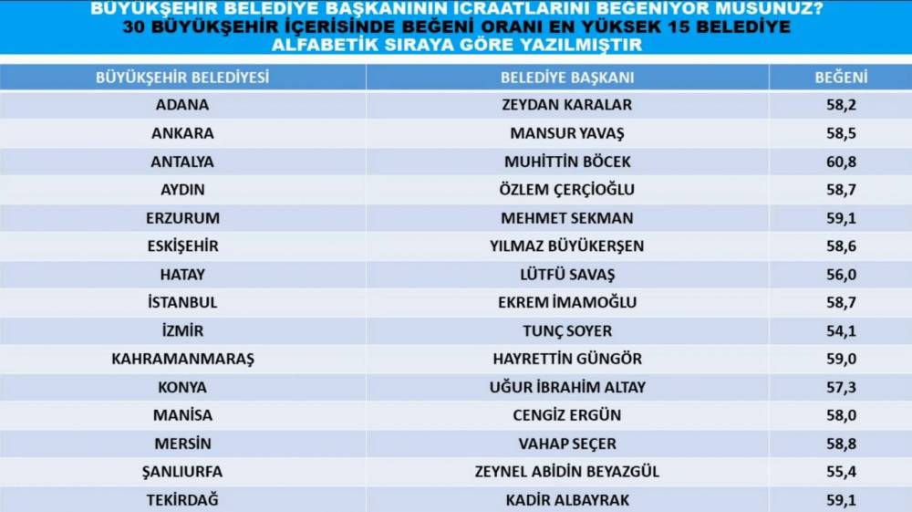 İstanbul Büyükşehir Belediye Başkanı Ekrem İmamoğlu yüzde 58.7, Ankara Büyükşehir Belediye Başkanı Mansur Yavaş yüzde 58.5, İzmir Büyükşehir Belediye Başkanı Tunç Soyer yüzde 54.1, Adana Büyükşehir Belediye Başkanı Zeydan Karalar ise yüzde 58.2 oranına ulaştı.