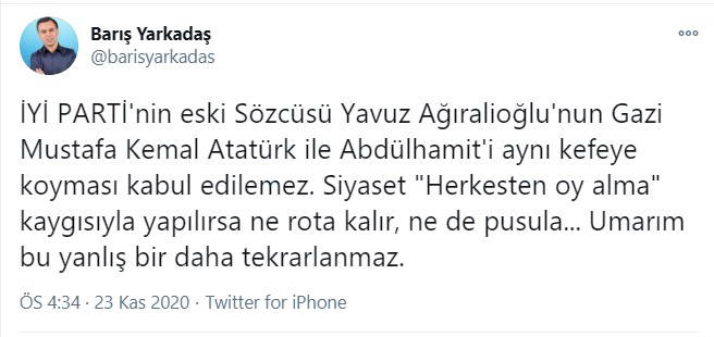CHP eski milletvekili Barış Yarkadaş da Ağıralioğlu’nun sözlerine tepki göstererek, “İYİ PARTİ'nin eski Sözcüsü Yavuz Ağıralioğlu'nun Gazi Mustafa Kemal Atatürk ile Abdülhamit'i aynı kefeye koyması kabul edilemez. Siyaset "Herkesten oy alma" kaygısıyla yapılırsa ne rota kalır, ne de pusula... Umarım bu yanlış bir daha tekrarlanmaz” ifadelerini kullandı.