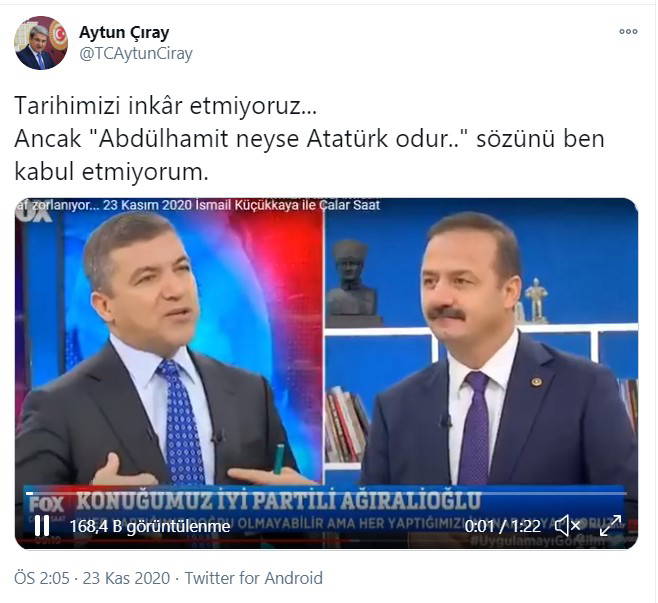 İYİ Parti İstanbul Milletvekili Yavuz Ağıralioğlu FOX Tv’de İsmail Küçükkaya ile Çalar Saat programının konuğu oldu. Küçükkaya’nın sorularını yanıtlayan Ağıralioğlu, Küçükkaya’nın Atatürk’le ilgili bir sorusuna “Abdülhamit neyse Atatürk odur..” yanıtını verdi.