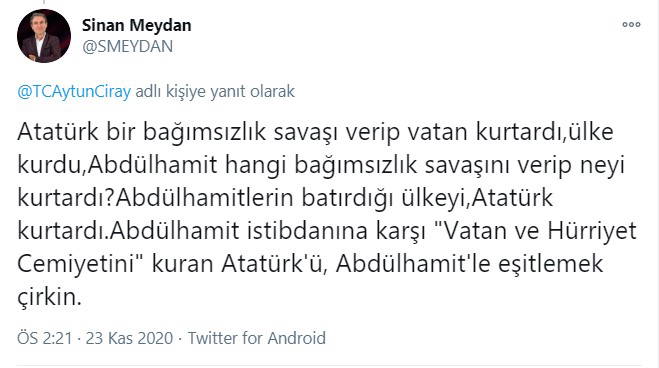 “Atatürk bir bağımsızlık savaşı verip vatan kurtardı,ülke kurdu,Abdülhamit hangi bağımsızlık savaşını verip neyi kurtardı?Abdülhamitlerin batırdığı ülkeyi, Atatürk kurtardı. Abdülhamit istibdanına karşı “Vatan ve Hürriyet Cemiyetini” kuran Atatürk’ü, Abdülhamit’le eşitlemek çirkin.”