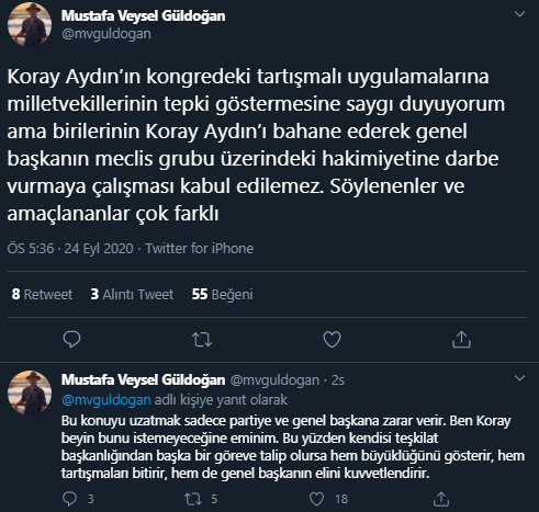 "Birilerinin Koray Aydın’ı bahane ederek Genel Başkan'ın meclis grubu üzerindeki hakimiyetine darbe vurmaya çalışması kabul edilemez. Söylenenler ve amaçlananlar çok farklı" diyen Güldoğan, "Bu konuyu uzatmak sadece partiye ve genel başkana zarar verir. Ben Koray beyin bunu istemeyeceğine eminim. Bu yüzden kendisi teşkilat başkanlığından başka bir göreve talip olursa hem büyüklüğünü gösterir, hem tartışmaları bitirir, hem de genel başkanın elini kuvvetlendirir" ifadelerini kullandı.