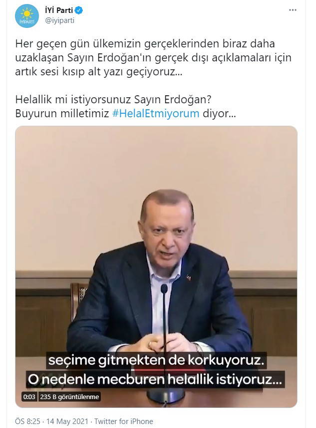 İYİ Parti, AKP Genel Başkanı ve Cumhurbaşkanı Recep Tayyip Erdoğan’ın 'helallik istediği' açıklamasını, ses ayarını kısarak ve parti fikirlerini alt yazı haline getirerek resmi sosyal medya hesabından paylaştı.