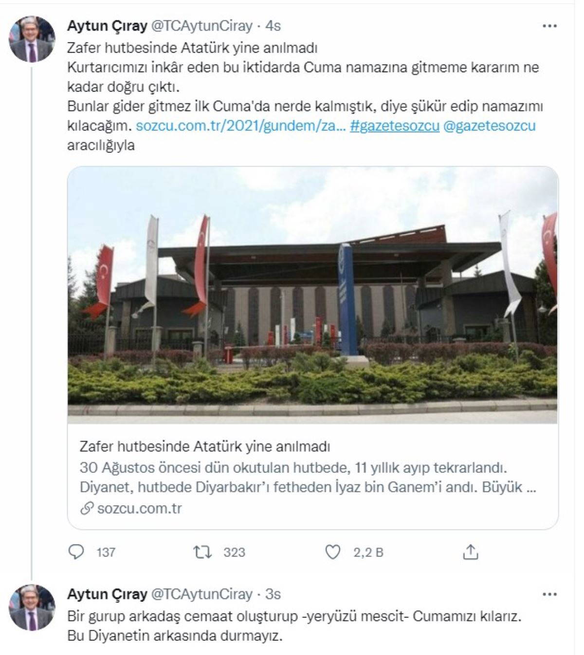Sosyal medya hesabından Diyanet'e tepki gösteren İYİ Partili Aytun Çıray, "Zafer hutbesinde Atatürk yine anılmadı. Kurtarıcımızı inkâr eden bu iktidarda Cuma namazına gitmeme kararım ne kadar doğru çıktı. Bunlar gider gitmez ilk Cuma'da nerde kalmıştık, diye şükür edip namazımı kılacağım” dedi.