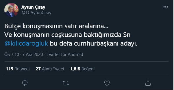 “Bütçe konuşmasının satır aralarına... Ve konuşmanın coşkusuna baktığımızda sayın Kılıçdaroğlu bu defa cumhurbaşkanı adayı”