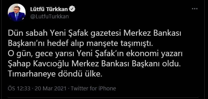 Lütfü Türkkan kişisel hesabından paylaştığı tweet ile iktidarın lehine yayın politikası belirleyen yeni Şafak Gazetesi'nde çıkan bir haberin ardından aynı gazetede yazı yazan Şahap Kavuncuoğlu'nun Merkez Bankası Başkanı olmasını "Tımarhaneye döndü ülke" sözleriyle yorumladı.