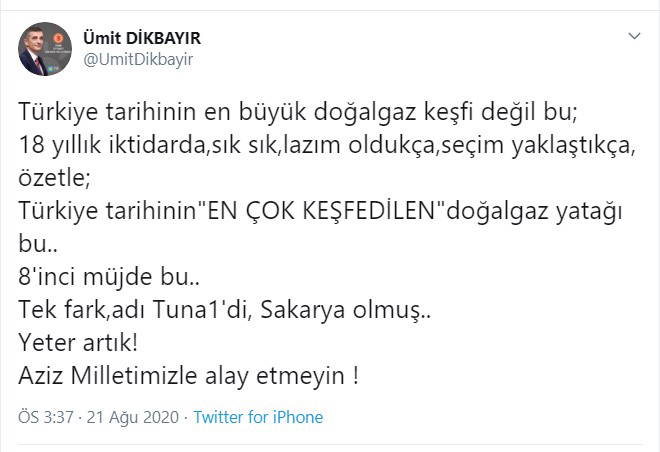 ''Türkiye tarihinin en büyük doğalgaz keşfi değil bu; 18 yıllık iktidarda,sık sık,lazım oldukça,seçim yaklaştıkça, özetle; Türkiye tarihinin"EN ÇOK KEŞFEDİLEN"doğalgaz yatağı bu.. 8'inci müjde bu.. Tek fark,adı Tuna1'di, Sakarya olmuş.. Yeter artık! Aziz Milletimizle alay etmeyin!''