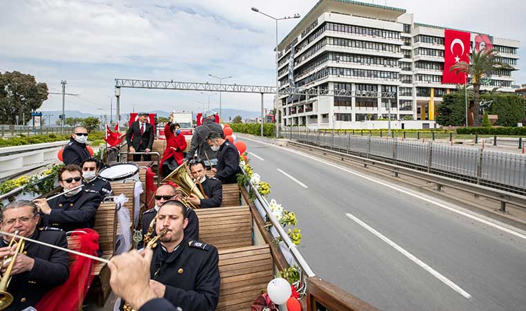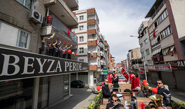 İzmir Büyükşehir Belediyesi, koronavirüs salgını nedeniyle meydanlarda yapılamayan 23 Nisan kutlamasını evlere, balkonlara taşıdı. Büyükşehir Belediye Başkanı Tunç Soyer ve eşi Neptün Soyer, üstü açık otobüsle kentin sokaklarında dolaşarak İzmirlilerin bayramını kutladı.