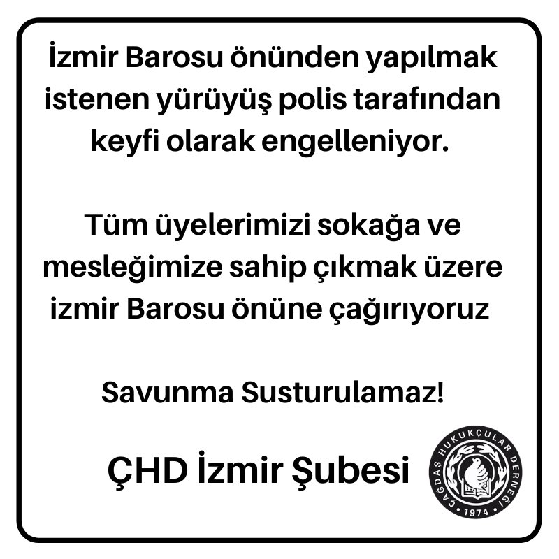 ÇHD İzmir yaptığı açıklamada, baro yürüyüşünün polislerce keyfi olarak engellendiğini ifade etti. ÇHD'nin açıklamasında, "İzmir Barosu önünden yapılmak istenen yürüyüş polis tarafından keyfi olarak engelleniyor. Tüm üyelerimizi sokağa ve mesleğimize sahip çıkmak üzere izmir Barosu önüne çağırıyoruz" denildi.
