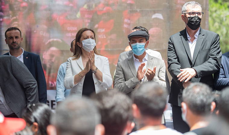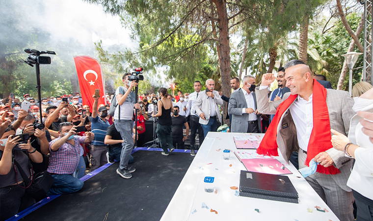 Törende konuşan İzmir Büyükşehir Belediye Başkanı Tunç Soyer, belediye işçilerinin hangi belediye şirketinde çalışırlarsa çalışsınlar, bu dönemin sonunda aynı düzeyde maaş alacağını ifade ederek eşit işe farklı maaş döneminin biteceğini vurguladı. Soyer, şöyle devam etti: “Görüyoruz ki toplum artık kutuplaşmayı, ayrışmayı, emek sömürüsünü, halkın sırtına basılarak liyakatsiz yükselmeleri, gelir adaletsizliğini, ülkenin zenginliğinden, refahından bir avuç insanın faydalanmasını ve kendisinin yoksulluğun pençesine atılmasını kabul etmiyor, isyan ediyor. Toplumun kılcallarından, yani en aşağılardan gelen bir dip dalga var. Ve bu dalga, son yerel seçimlerle beraber siyasi atmosferi ve baskı altındaki toplumu değiştirdi, değiştiriyor. Biz, kibrin ve tahakkümün karşısına; gençlerin, kadınların, işçilerin, emekçilerin, toplumun tüm kesimlerinin haklı taleplerini ve özgürlük haykırışını koyduk. Yelkenlerimizi, aşağıdan yükselen bu değişim rüzgarını içine alacak şekilde açtık.”