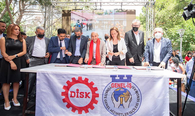 İzmir Büyükşehir Belediyesi şirketi İZENERJİ ile Büyükşehir Belediyesi’nde örgütlü Devrimci İşçi Sendikaları Konfederasyonu'na (DİSK) bağlı Genel-İş İzmir 2 No’lu Şube arasındaki yedinci dönem toplu iş sözleşmesi, Kültürpark'ta düzenlenen törenle imzalandı. 10 bin işçiyi kapsayan ve maaşlara yüzde 26 ile 30 arasında zam öngören sözleşmenin imza törenine; İzmir Büyükşehir Belediye Başkanı Tunç Soyer, İzmir Büyükşehir Belediye Başkan Vekil Mustafa Özuslu, DİSK Genel Başkanı Arzu Çerkezoğlu, Genel- İş Genel Başkanı Remzi Çalışkan, DİSK Ege Bölge Başkanı Memiş Sarı, DİSK Genel İş 2 No'lu Şube Başkanı Arif Yıldız ile sendika temsilcileri, İzmir Büyükşehir Belediyesi Genel Sekreteri Dr. Buğra Gökçe, belediye bürokratları ve işçiler katıldı.