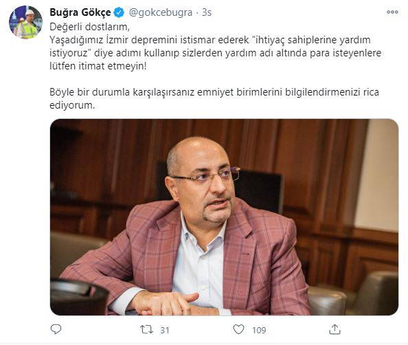 “Değerli dostlarım, Yaşadığımız İzmir depremini istismar ederek ‘ihtiyaç sahiplerine yardım istiyoruz’ diye adımı kullanıp sizlerden yardım adı altında para isteyenlere lütfen itimat etmeyin! Böyle bir durumla karşılaşırsanız emniyet birimlerini bilgilendirmenizi rica ediyorum”